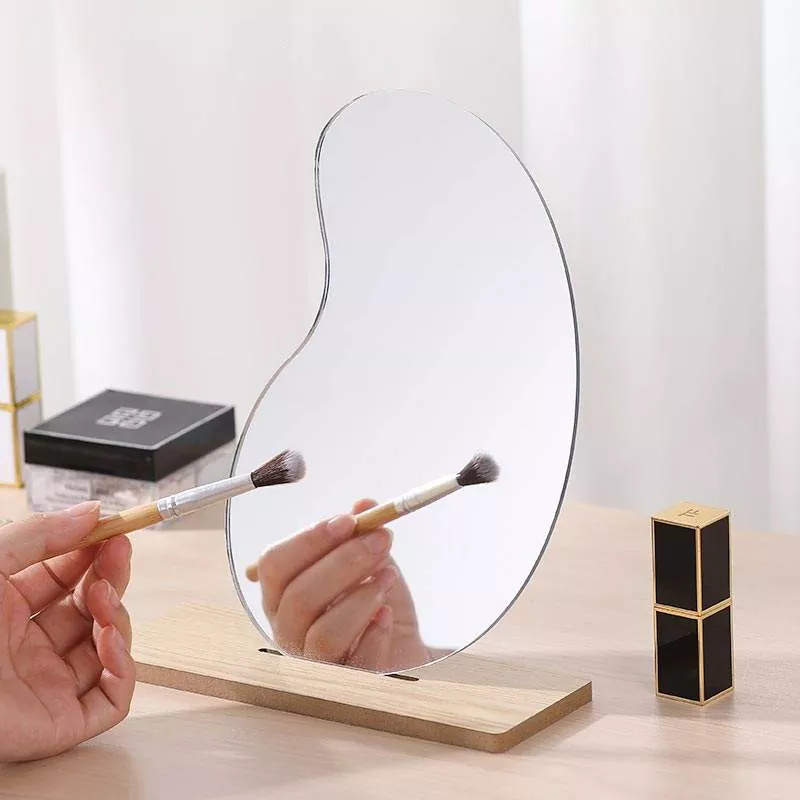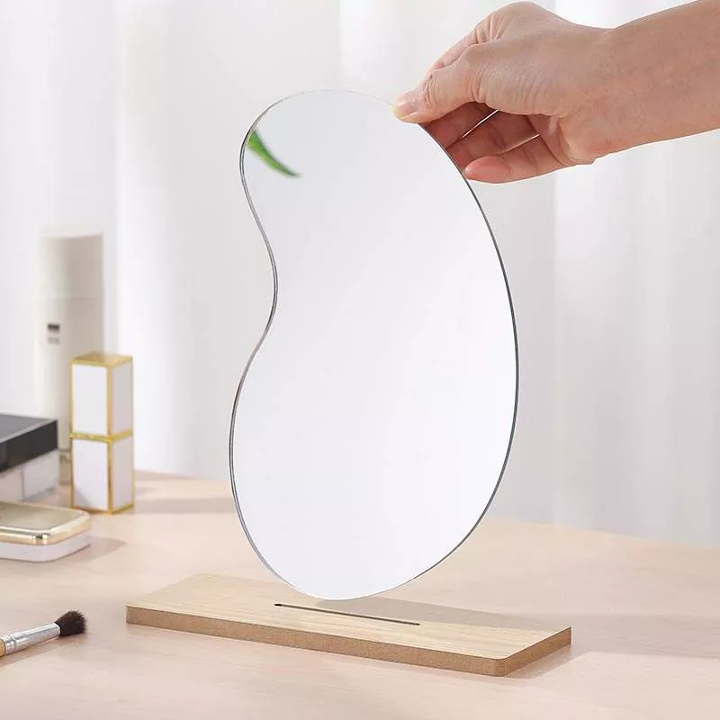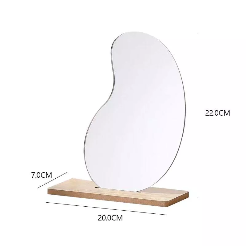 Această oglindă de masă ondulată neregulată are o siluetă minimalistă, artistică, care se îmbină perfect cu decorul modern al casei. Fabricat cu sticlă transparentă de înaltă definiție și o bază netedă din lemn, oferă o reflexie fără distorsiuni, ideală pentru aplicarea machiajului, rutinele de îngrijire a pielii și îngrijirea zilnică.