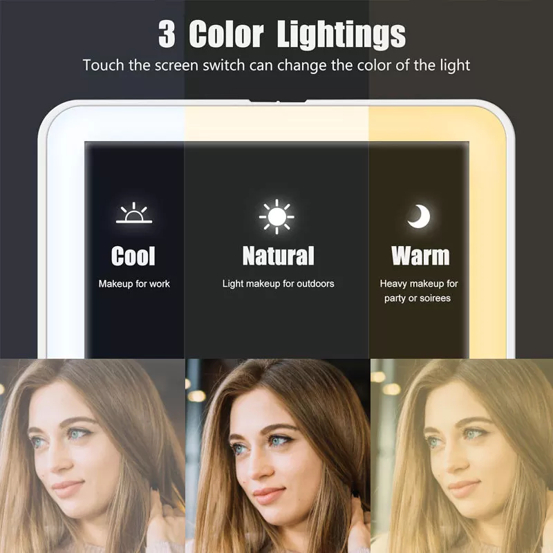 Această oglindă de machiaj cu LED de masă are trei moduri de lumină reglabile (rece, naturală, caldă) pentru a se potrivi tuturor scenariilor de machiaj. Lumina rece este ideală pentru machiajul de lucru, lumina naturală pentru look-urile în aer liber și lumină caldă pentru evenimentele de seară. Inelul LED moale, fără pâlpâire, oferă o redare reală a culorilor, asigurând o aplicare precisă a machiajului chiar și în medii slabe.